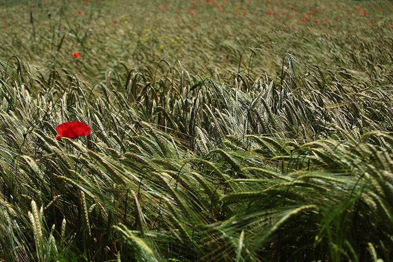 Di papaveri se ne vedono molti in questi giorni,ma questo scatto sembra particolarmente riuscito per lo stacco che il soggetto riesce a ottenere sul mare di spighe agitato.