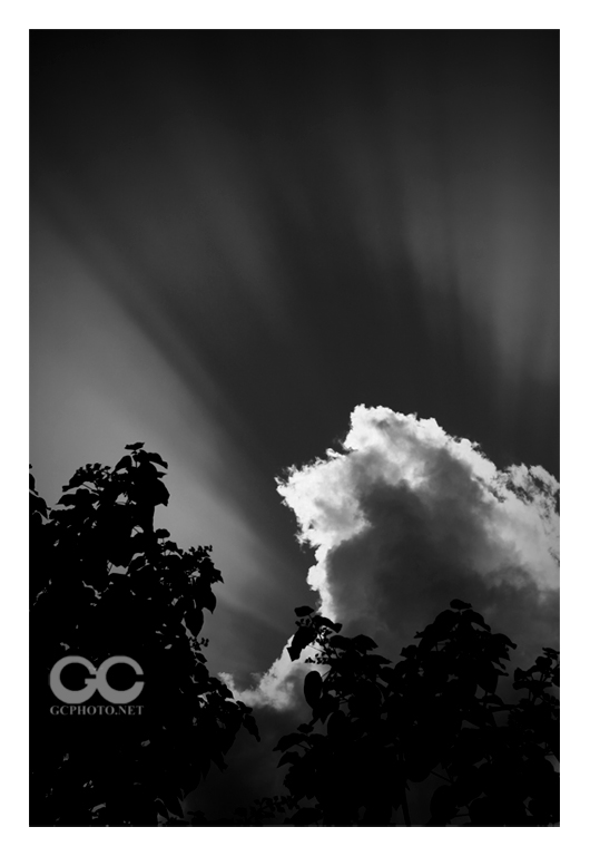 Neri chiusissimi, la vegetazione una densa silhouette e quella quasi epifania di luce sulla grande nuvola soffice. Il cielo un comprimario funzionale, una raggiera di fasci di grigio che investono il tutto, coem luci da palcoscenico. Non è male, molto personalizzata, quasi a materializzare una scenografia... Piùà concettuale che paesaggistica...