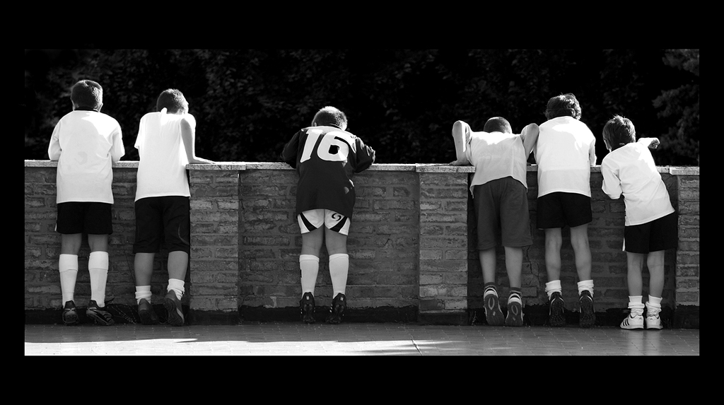 momento colto particolarissimo con i bambini sulla punta dei piedi a scrutare al di là del parapetto con sguardi che vanno in molteplici direzioni non avendo ancora individuato l'oggetto....