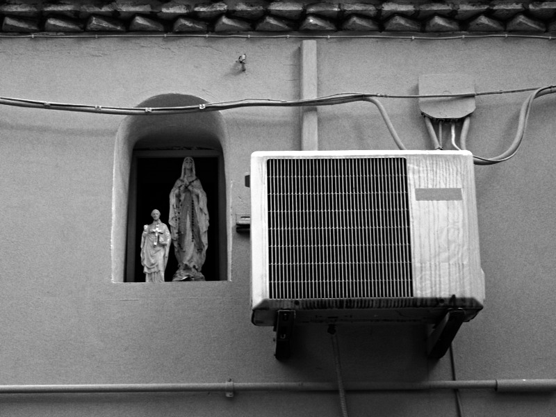Però non mi convince del tutto. Le statuette sono sfuocate, troppo rispetto al condizionatore, e sono anche un po' troppo in ombra; ci sono troppi tubi e fili che corrono, che distraggono molto. Forse era meglio stringere ancora di più l'inquadratura (ma forse è già un crop...).
