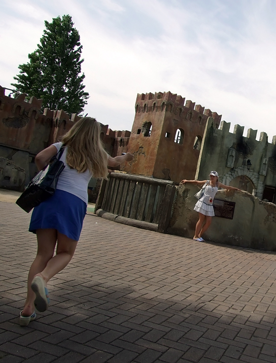 Ora, credo che una corra verso l'altra, intenta a mettersi in posa sembra, portando qualcosa in mano, ma non si capisce cosa. Forse un titolo di estrema sintesi avrebbe aiutato.