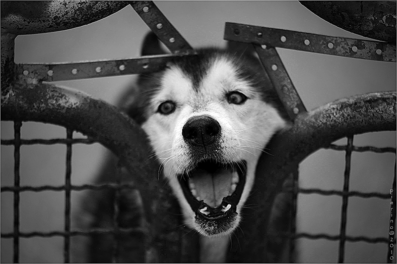 Avrei preferito avere a fuoco gli occhi ma forse il tuo intento era quello di mettere in evidenza la faccia del cane fuori dal cancello. Il soggetto principale secondo me rimane troppo centrale senza dare vitalità all'immagine