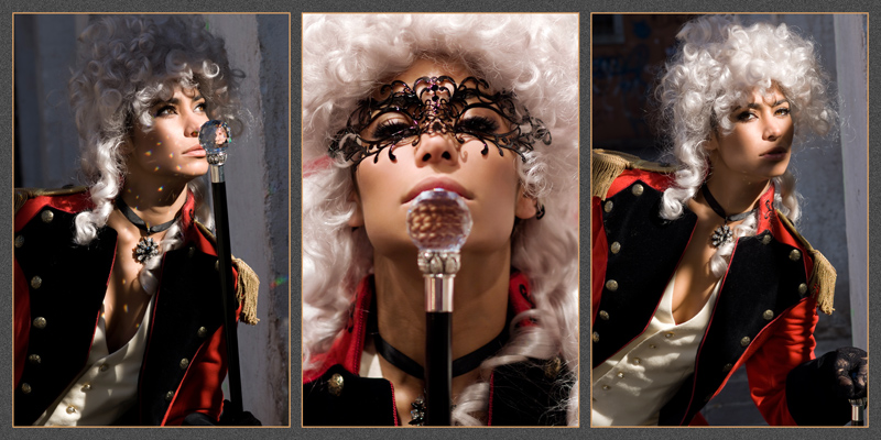 Facendo rientrare la foto, nella sezione "Foto in costume settecentesco", trovo la foto centrale con la maschera molto ben realizata, l'attenzione dalla palla si sposta direttamente alla maschera e agli occhi e al viso in un secondo momento.