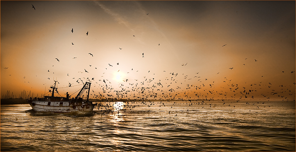 Bella questa presenza massiccia di volatili in codazzo tutti attirati dalla presenza del pesce sul peschereccio. Bello il colore della luce e la sua atmosfera.