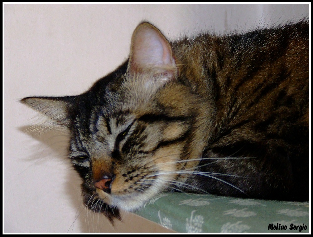 E' bruttina questa foto, colori smorti, il fuoco che va a cadere sulla schiena, gli occhi chiusi, da rifare, se la vede il gatto ti odia.  |