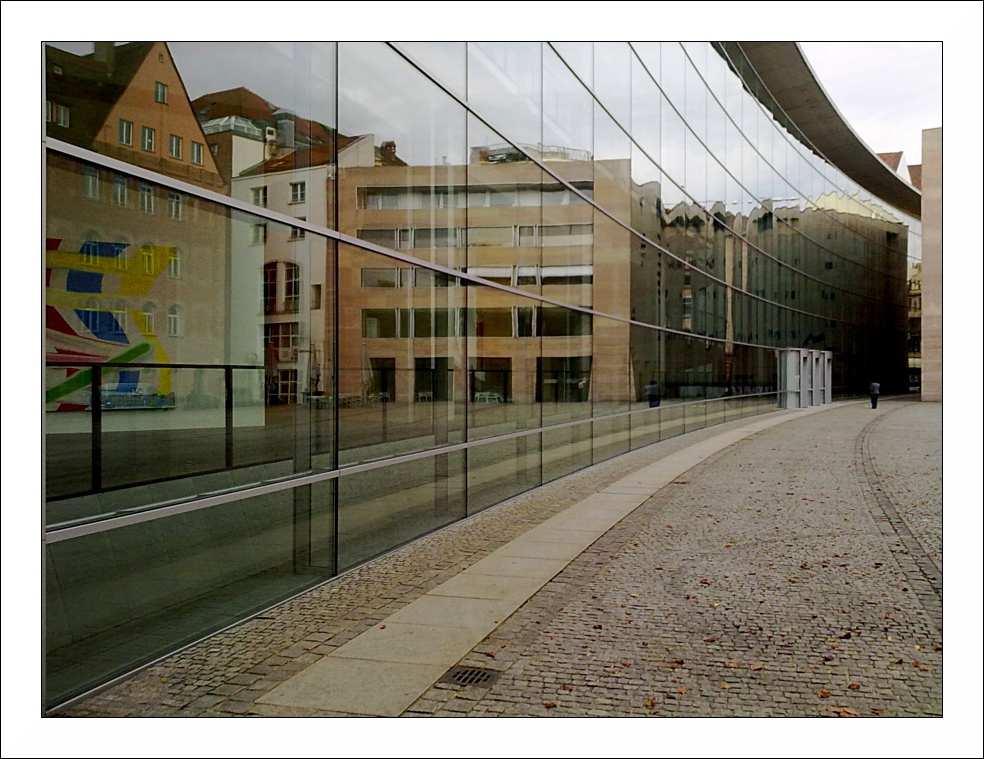 Il soggetto della foto è duplice (come credo che accada spesso in foto di riflessi), ovvero: l'architettura dell'edificio con vetrata (che è un museo di arte contemporanea) e l'architettura degli edifici riflessi (architettura di Norimberga).