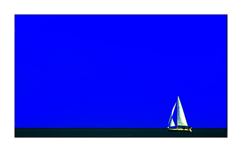 Il cielo (saturo all'inverosimile) è talmente piatto da sembrare finto, così come il perimetro delle vele della barca.. insomma il tutto sembra molto posticcio.