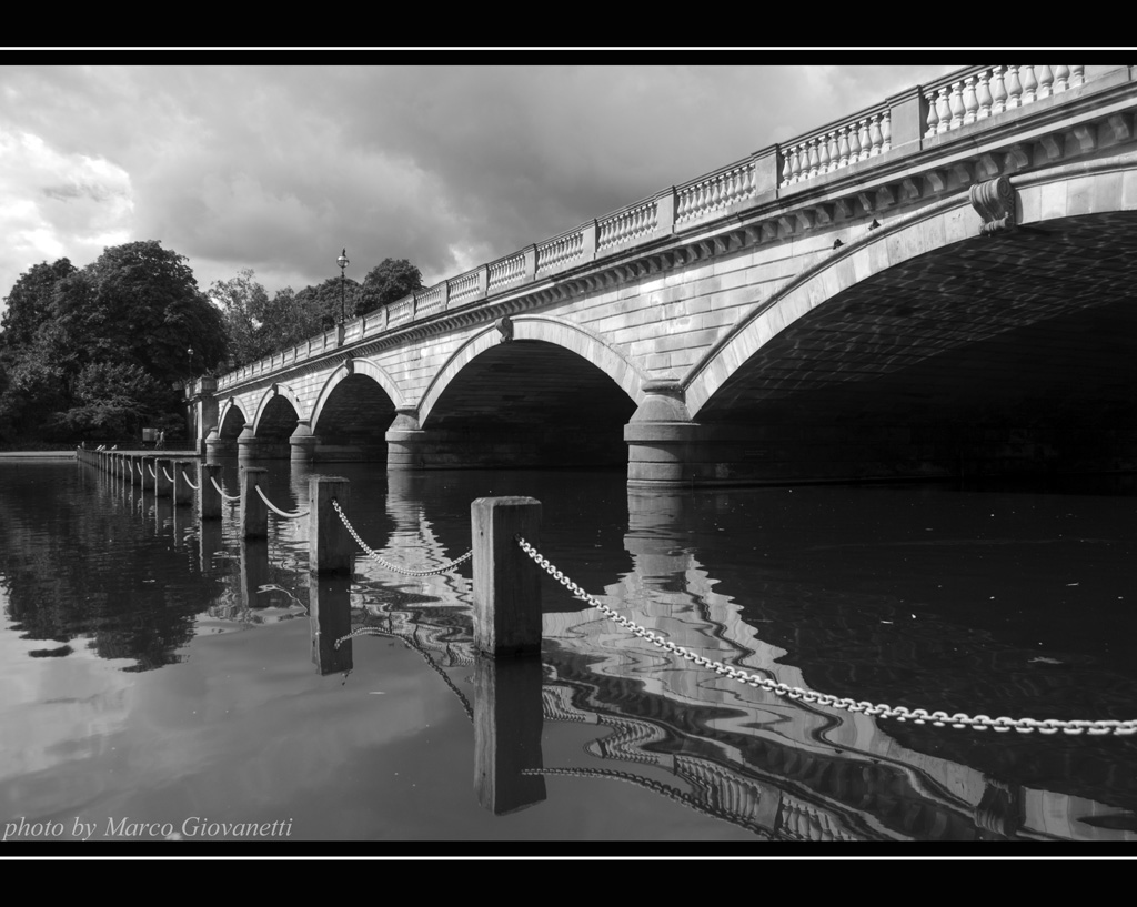 Buona composizione con gli archi del ponte che sembrano giocare con le curve delle catene.