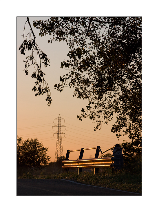 Questa volta no ti sei fatto mancar nulla: il traliccio immancabile e pure il guard rail sgarrupato ed ammaccato a guidare lo sguardo. Tutto per dirti scherzosamente che mi paice moltissimo: per la luce, per la quinta vegetale in silhouette, per la luce dorata sul ferro... che hai preso nel momento perfetto. Però il traliccio, concedimelo, stavolta mi pare un po' invadente; era lì e non si poteva scegliere, ma ce la mette tutta per attirare, a torto, la nostra attenzione.