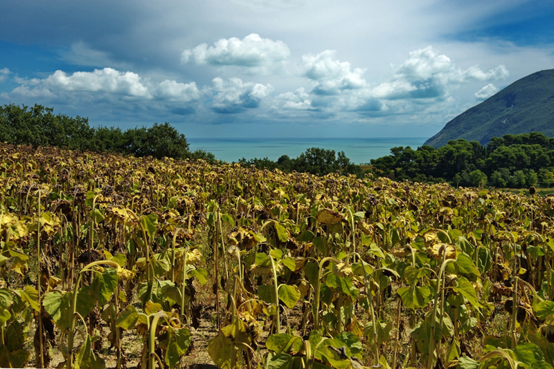 i girasaoli sono afflosciati è vero ma il bellissimo cielo all'orizzonte è un segno che qualche scampolo d'estate ci sarà ancora.