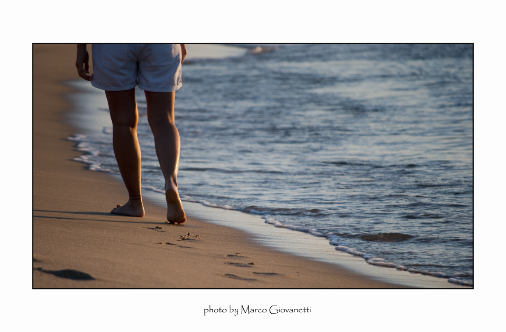 il taglio di questa foto personalmente non piace... Avrei impostato diversamente.. Avrei preso più dall'alto le impronta dei piedi lasciati sulla sabbia come il passaggio di una persona in quel bellissimo mare tranquillo e sereno.. Per dare la sensazione di una passeggiata solitaria... Scusami se mi sono permesso di questa mia opinione.. é solo soggettiva!! A parte quelle gambe il resto piace...  |