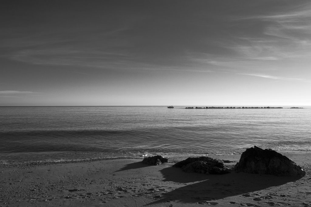 L'uso del bianco e nero, in genere, tende a sottolineare il contrasto di masse ed a tal proposito la scelta del taglio panoramico tende a diluire verso sinistra i contenuti: per cui avrei, dopo un leggero decentramento verso destra, optato per il taglio quadrato.