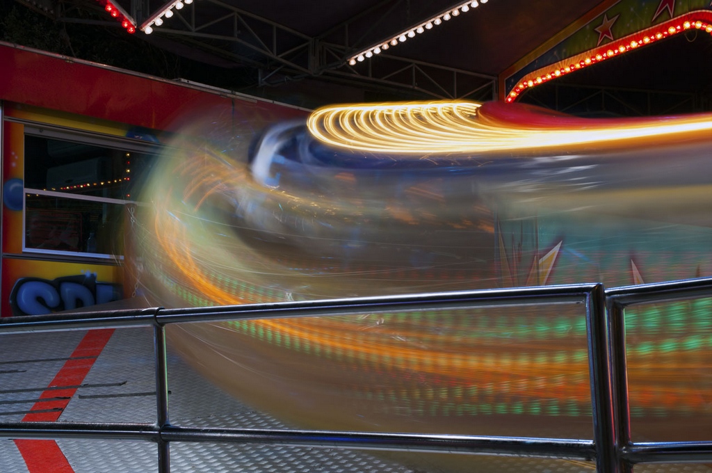Anche a me la composizione non mi convince del tutto. Proverei a stringere di più l'inquadratura perché hai sia la ringhiera che la parte statica della giostra dentro la scia che trasmettono il contrasto col movimento.