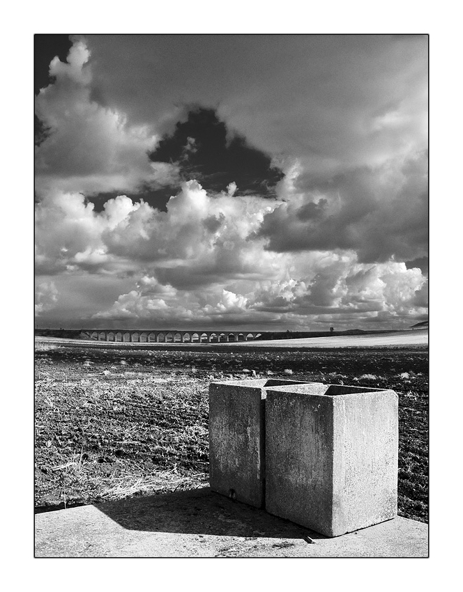 Molto particolare e molto bella e sopratutto acuta. La scelta compositiva infatti, in verticalità è tale che, nella sua centralità, nonostante la forza e grandezza relativa dei due elementi in pp e la maestosità del cielo gonfio di nuvole, il sottile profilo del viadotto resta ugualmente protagonista, e destinazione finale della attenzione del nostro sguardo.