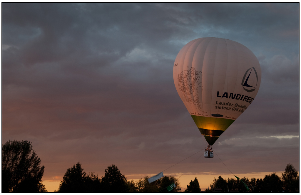 Questi colori sono proprio indovinati per questa che tu piacevolmente chiami "lanterna nella sera"....mi chiedo se sei riuscito a scattare anche con le briglie sciolte , credo sarebbe ottima vederla "stampata" i cielo questa mongolfiera