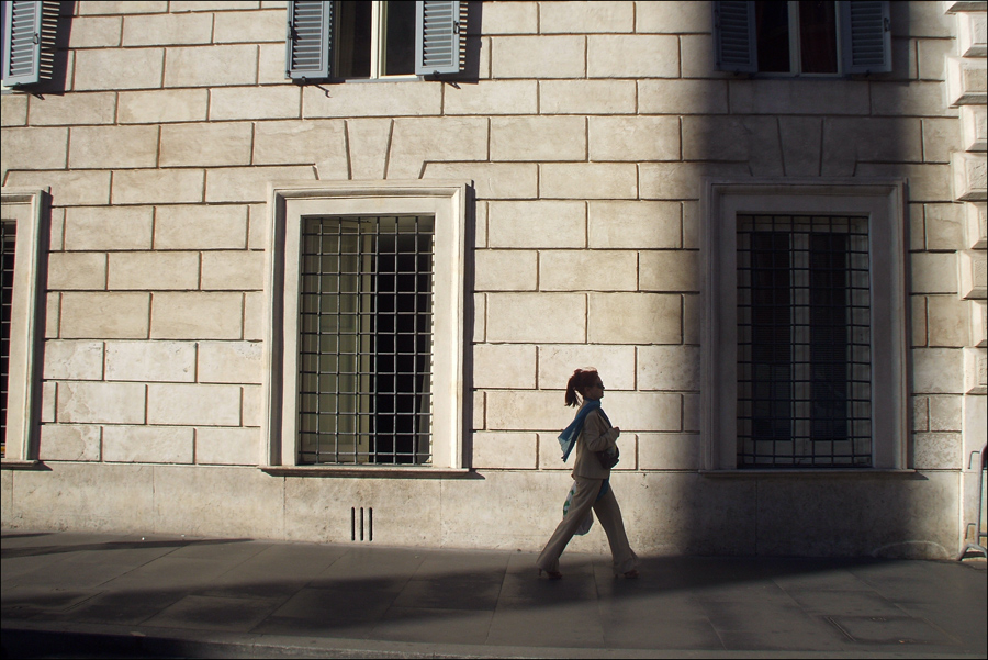 E questa? E' solo una donna che cammina in una strada...solo ad uno sguardo distratto e di chi magari mastica poco di foto stradaiola...ho appena criticato negativamente una foto con la stessa tematica ma completamente agli antipodi per forza dell'autore e qualità contenutistica. C'è tutta una serie, parlerei di un vero e proprio filone, di scatto urbano in street dedicato all'uomo nel contesto urbano, con le luci e le ombrfe che diventano essenziali nella struttura compositiva.