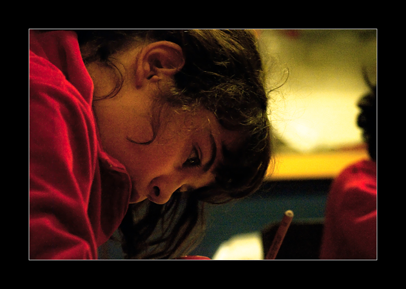 L'idea è buona ma sarebbe stata migliore includendo quello che la bambina sta facendo (penso scrivendo). Così invece rimane un pò tutto strozzato. Da rivedere, ma da premiare l'impegno.