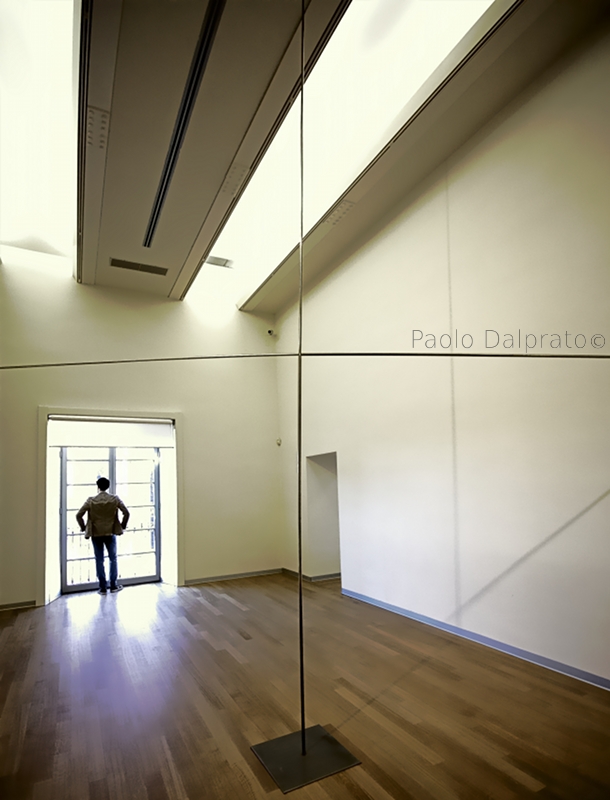 Un riflessione architettonica al servizio del protagonista. In bella luce e con la preziosità aggiunta di quella croce che si crea nel vetro, e che si curva malleabile alle leggi dell'ottica.