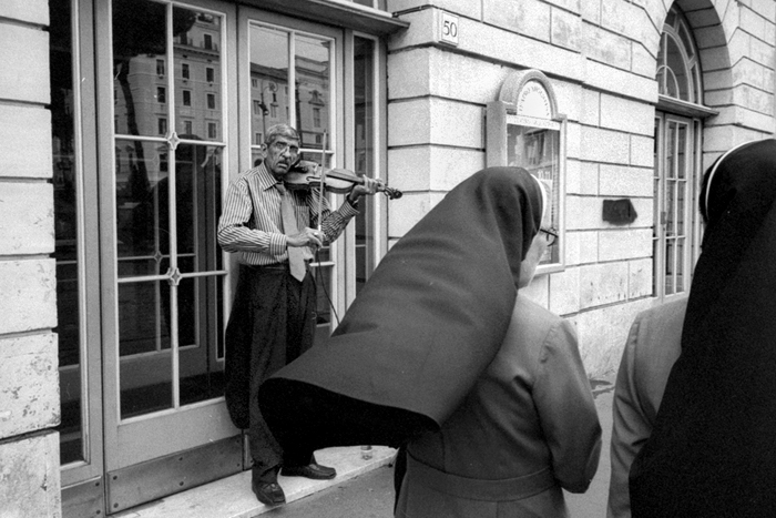 Il nostro Nash intuisce bene la scena ma non riesce a racchiuderla bene. Quel meraviglioso cappello svolazzante l'avrei isolato bene su quel muro bianco posteriore, senza sovrapporlo al suonatore di violino. Avrei atteso qualche attimo dopo, il tempo di uno o due passi, quel tanto necessario ad aprire queste figure nell'inquadratura, a dargli un loro spazio vitale, e la scena sarebbe stata più equilibrata. Qui hai un vuoto di partenza, all'inizio della lettura, e subito dopo, una concentrazione di elementi, con quel buon fattore street, rappresentato dalla forma svolazzante del cappello, che rimane in antagonismo con la figura del suonatore, quasi si confonde, invece di relazionarsi visivamente e mentalmente.
