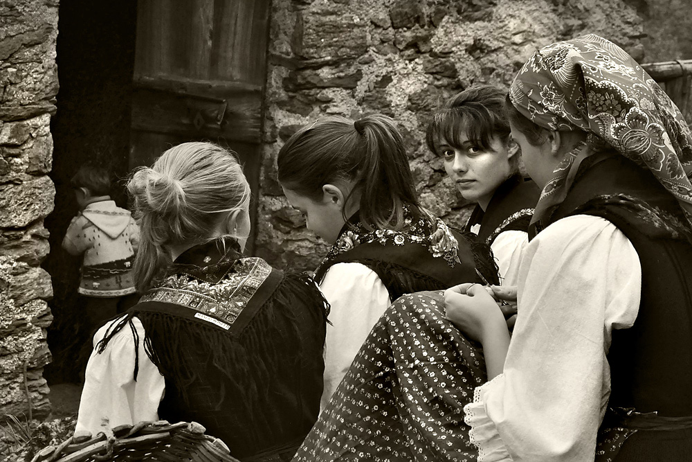 In questa foto la prima cosa che balza all' occhio sono le maniche delle donzelle e la varietà di ricami chiari; lo sguardo della ragazza, che nelle tue intenzioni dovrebbe reggere la foto, viene dopo. Ora è chiaro che guardando e riguardando la foto la si assimila e quindi poi si fissa nelle mente l' importanza di quello sguardo. Ma la cosa non è immediata, è questo il punto. Dopo di che, pure una volta assimilata, la visione resta appesantita; è difficile concentrarsi su quegli occhi e goderne dell 'intensità:troppe le distrazioni. Allora che si fa?