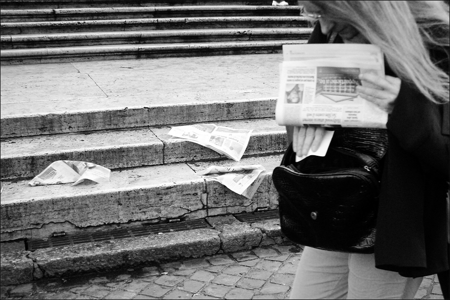 | Io la vedo debole Hero: al di là di un probabile contrasto di atteggiamenti non riesco a percepire altro. Proietti l'attenzione dell'istantanea, mediante le scelte di fuoco e tonali (sovraesposizione), su quelle pagine di giornale riverse in terra, al di sopra di quegli scalini. Non una pagina singola, ma diverse, sparse in un certo spazio; ne abbiamo forse un'altra, accartocciata nei piani alti del frame, davanti al viso della ragazza sfuocata : non quindi un'accidentale folata di vento che ruba un singolo foglio ma il risultato di una vera e propria maleducazione. Poi, ci fai relazionare il tutto con la meticolosa e decisa stretta del quotidiano, associata all'ordinato e composto movimento di imbustamento di un'altro piccolo foglietto all'interno della borsa della ragazza. Potrebbe essere la tua volontà di evidenziare diversi atteggiamenti comportamentali e diverse educazioni. Mi sembra un messagio forzato per questa specifica istantanea. Curioso di sapere il motivo dello scatto. |
