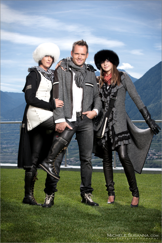 In effetti la foto deve risalatare al meglio l'abbigliamento (è stata fatta per il distributore in italia di questo abbigliamento) intento era di legare il "verde" e le alpi delle location mondane con il moderno della ringhiera alle spalle...