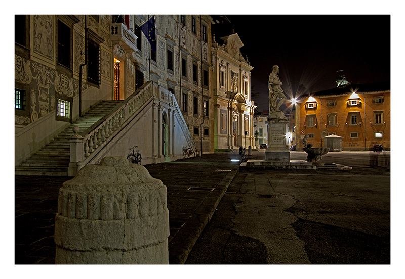 Ringrazio per l'attenzione vLuca , Habrax e NEROAVORIO. Sì, è anche uno studio, era la prima prova sul campo del nuovo obiettivo. Tuttavia, il colonnino istoriato (chiamarlo paracarro mi sembra un po' riduttivo) per la verità avevo fatto i salti mortali per mettercelo... mi ci piaceva... Eliminarlo sarebbe stato facile, naturalmente. Ma, come dicevo, questa era l'inquadratura che desideravo. Tanto che ne ho ripetuta poco dopo una seconda piuttosto simile, con diaframma più chiuso per aumentare la profondità di campo e tempo più lungo (f/16, 30 secondi), sotto acclusa. Non è ovviamente la vista più classica di Piazza dei Cavalieri. Penso che posterò in seguito qualche altra delle foto fatte nella stessa serata in Piazza dei Cavalieri.