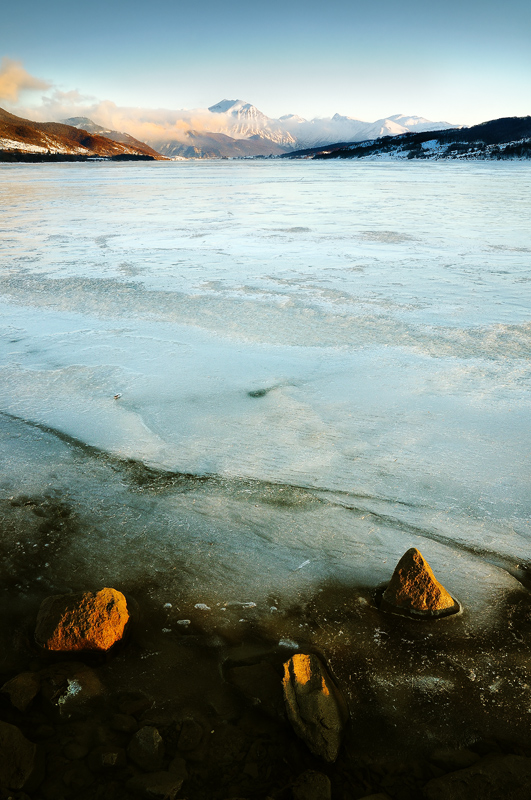 Forse ha ragione Giovanni...mi colpisce però l'utilizzo che ne fai...la bella assonanza compositiva, il richiamo tra le tre pietre (o pepite d'oro Very Happy ) e le montagne pure disposte in qualche modo in trilogy...quasi che i massi siano montagne in divenire...splendida la luce e questa scelta cromatica azzurrina...