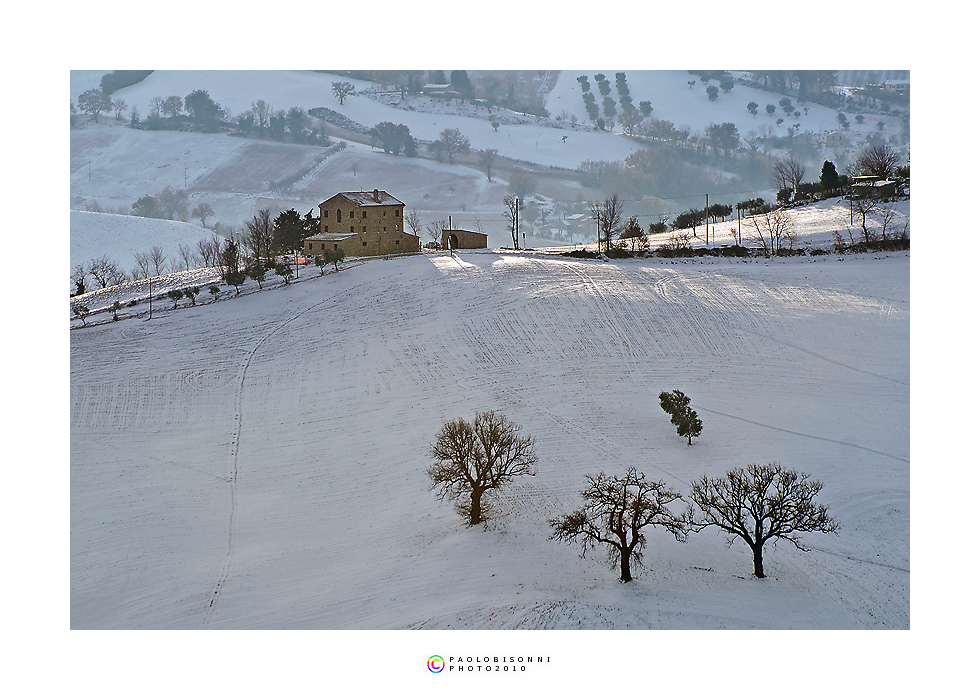 quella lama di luce che lambisce il crinale, da ancora più forza a questa bella immagine della tua campagna marchigiana innevata; la composizione è ben fatta, con gli alberi ed il casolare posizionati nei punti strategici; la focale usata addolcisce i piani e le linee.