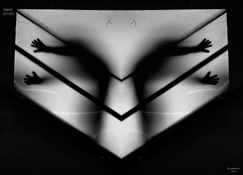 Certe volte le tue immagini sono come un monito, si aprono alla vista come scatole cinesi che ne racchiudono altre, e non sempre la sorpresa è rassicurante. Qui c'è la ineluttabilità del nero a fare da sontuosa cornice alla durezza di quell'angolo acuto rivolto in basso, come una coccio aguzzo che può abbassarsi e ferire. Al lati si apre il dispiegarsi di piccole dita, mani che palpano superfici che paiono di vetro, in uno scandaglio che sembra frenetico e senza uscita. Una foto che si articola come accorata richiesta di multiplo aiuto, un grido solenzioso nel nero e nel contrasto. Per tutte queste ragioni la trovo molto, molto particolare ed efficace.