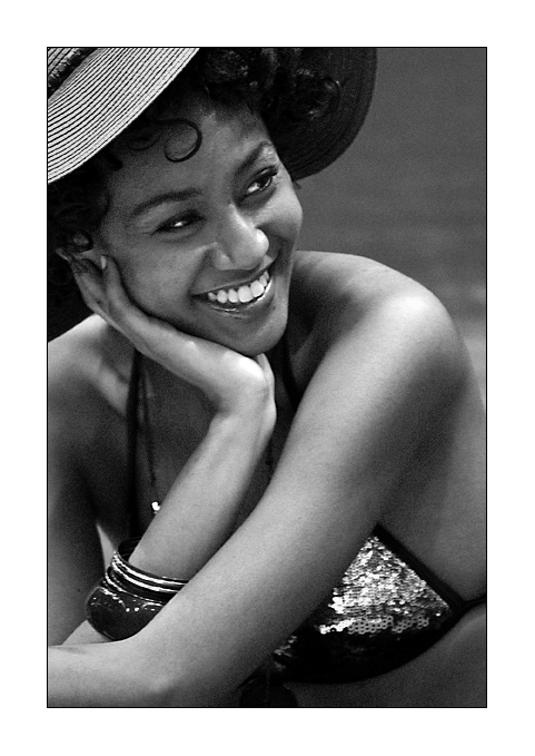 Un vecchio ritratto scattato al photoshow dell'anno scorso convertito in BN con la tecnica di Rob Carr, una aggiustatina ai livelli e alle curve, un pò di vignettatura ed infine una leggera grana.