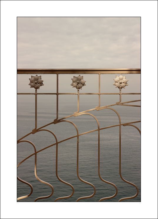 Pio ha la grande capacità non di fotografare il bello, ma di comporlo.Con pochi elementi quali il disegno gentile di una ringhiera, il riflesso dorato del sole,il verde dimesso del mare e il rosa delicatissimo del cielo nel suo piccolo laboratorio mentale prendono vita, per sintesi, le forme del bello. Un abile artigiano guidato dal cuore. Questa immagine è bellissima.