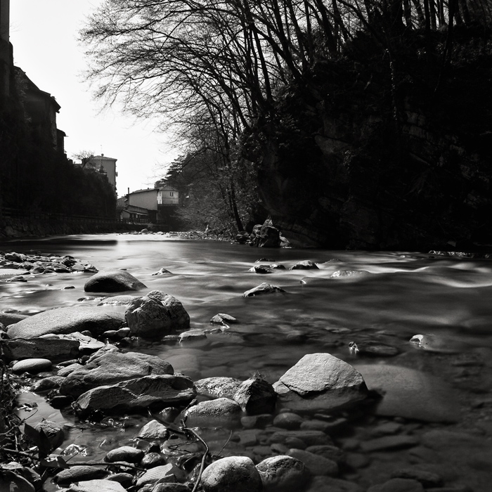 Sopratutto la resa dell'acqua, quasi piombo liquefatto che scorre placidamente, è bellissima. La visione in bianco e nero ha impedito ad una certa aberrazionen cromatica di mortificare il controluce. L'unica cosa che mi lascia un po' perplessa è la imponenza e chiusura dei neri nella parte della vegetazione.