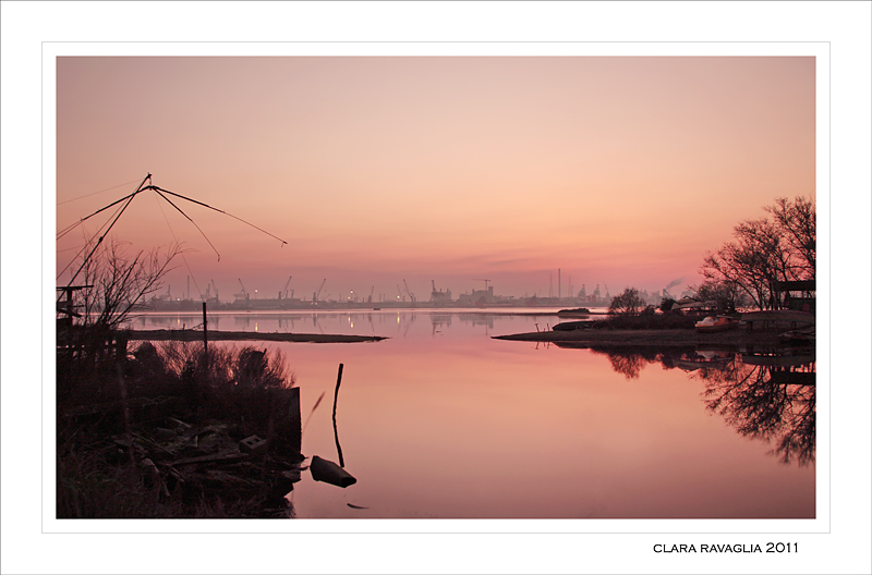 Quando i contrasti si spengono, quando anche l'uomo e le sue macchine tacciono insieme alla natura e tutto tende ad amalgamarsi in questa rosea atmosfera e la quiete, ancor più segnata dallo specchio d'acqua, sopraggiunge...restano solo i pensieri e l'amarezza. E' una mia lettura Clara..un mio modo di leggere e di sentire questo paesaggio.