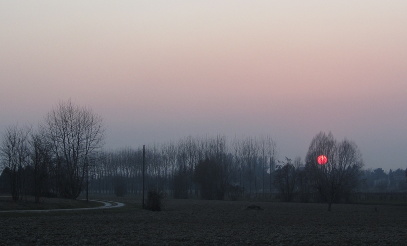 Molto bella la stradina, che se ne va chissà dove, e il sole rosso sapientemente coperto dai rami, che cattura il nostro sguardo.