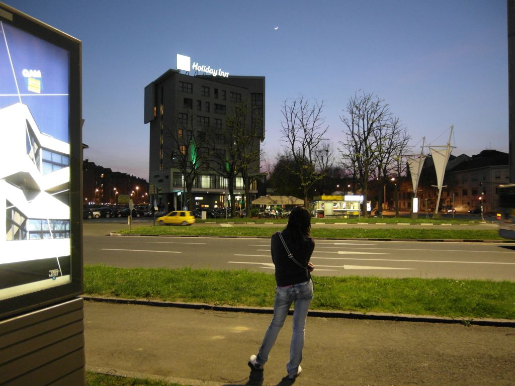 Volevo fotografare la piazza, ma un soggetto in primo piano mi aiuta sulla profondità. La stessa sera ho fatto altre foto della piazza, questo è quella che mi sembra più riuscita. Se dovessi tornare indietro, sposterei l'inquadratura un po' a sinistra. Entrerebbe tutto il pannello elettronico pubblicitario a sinistra, che immagino come un gioco di specchi con l'Hotel, sposterebbe un po' a destra la ragazza. Il risultato sarebbe probabilmente più equilibrato. Almeno mi sembra:-)))