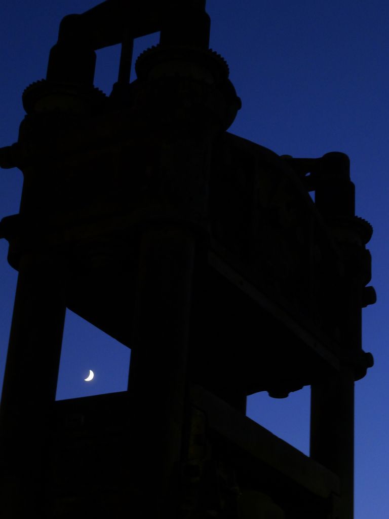 Quella pressa ha perso la sua forza, staccata com'è dai martinetti e dai motori, e vede ciò che un tempo le era precluso, condannata com'era ad una perenne notte senza cielo: il sole e la luna.
