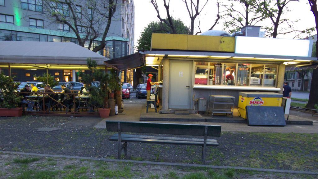 non capisco il spggetto della foto: la panchina, il cameriere, la gente seduta, i colori.