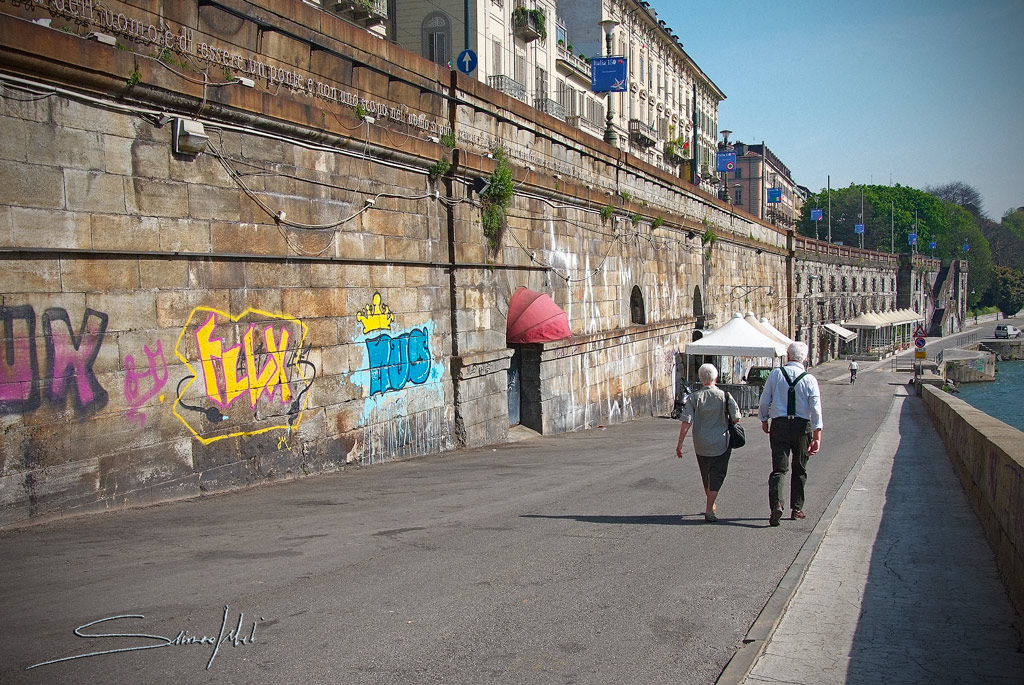 qui si vedono due persone anziane che camminano lungo degli argini (cosa è, il PO?) e sulla sinistra delle scritte sul muro.