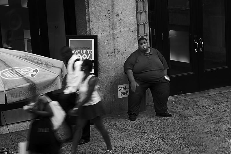 In questo caso particolare la foto è stata scattata in USA dove , purtoppo per loro, l'esuberanza sulla bilancia non è un caso raro anzi è quasi una mosca bianca una persona normopesa. io che sono un pò in carne mi sentivo un grissimo ) . Quindi fotografando questo signore proprio non ho pensato di metterlo alla berlina per il suo stato fisico , se avessi allargato con un grandangolo probabilmente nello stesso marciapiede avremmo visto almeno altri 4/5 oversize