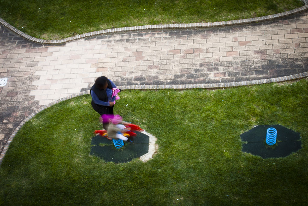 Mi sarebbe piaciuta una maggior "geometrizzazione" degli elementi presenti, una cura dell'inquadratura quasi fosse stata una foto di architettura, geometrizzazione che poi andrebbe ad esaltare, per contrasto, le forme create dalle due figure umane. Le basi dei due dondoli (visti dall'alto mi danno l'impressione di due enormi occhi) potevano essere posizionate ad uguale distanza dai margini laterali; le linee date dalla pavimentazione potevano essere riprese parallele all'asse orizzontale della foto, senza quindi quell'inclinazione, che conferisce un senso di pendenza.