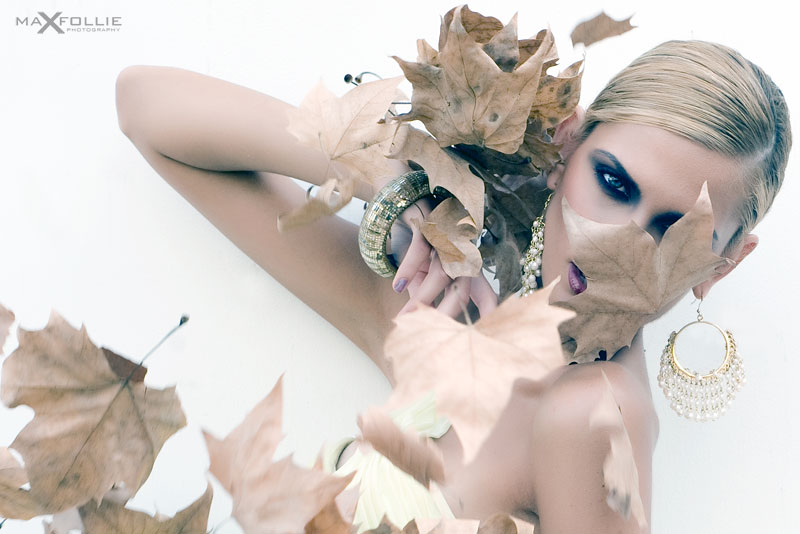 Il gioco delle foglie in movimento suggerisce una profondità che si annulla sul volto della modella; l'effetto vedo-non-vedo e la composizione diagonale attirano verso lo sguardo, un vero e proprio "buco nero" dell'intera foto.