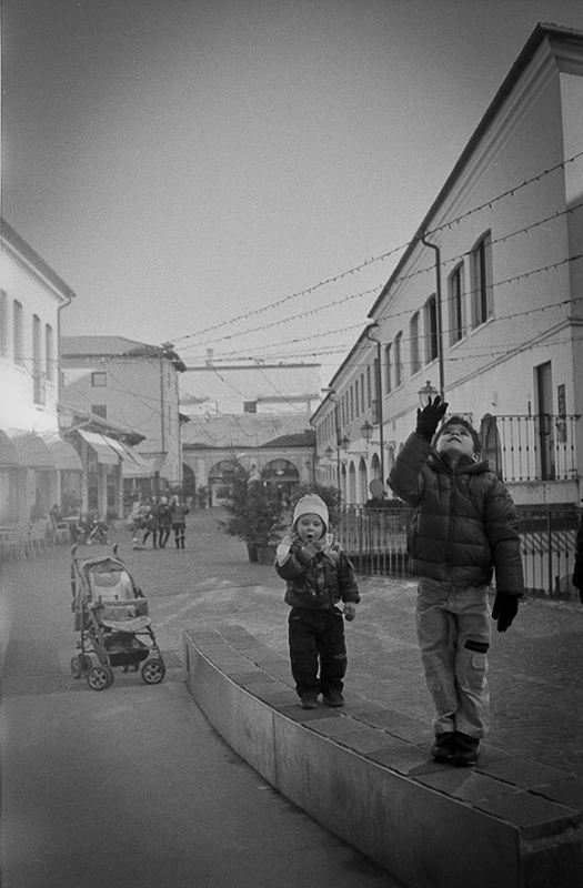 E' il racconto di una evoluzione, un climax ascendente da sinistra verso destra: un passeggino, ormai vuoto, un bambino, un altro più grandicello, portato con i suoi sogni e la sua fantasia a guardare ed a pensare chissà a cosa..