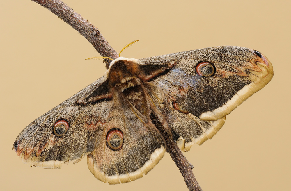 E' una Saturnia piri, non molto facile da gestire fotograficamente, a causa delle sfumature biancastre sulla testa e ai bordi delle ali, con il resto abbastanza scuro, in questo caso credo tu abbia voluto mettere in evidenza le ali!