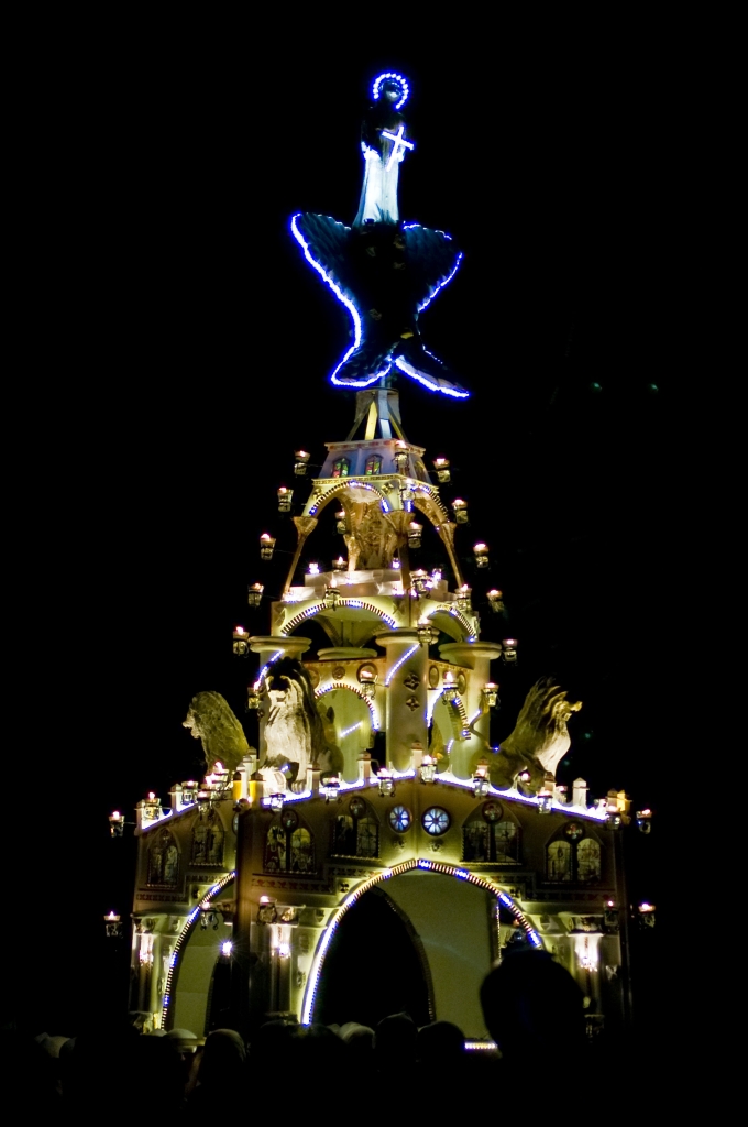 La street photography è un genere che fonda i suoi contenuti su un’istantanea della vita umana, colta nelle sua genuinità, nella sua quotidianità e nei suoi molteplici aspetti: una scena curiosa, l’imprevedibilità di un attimo, la bellezza o la tragedia di un momento. Per quanto il contesto sia quella della festa della Santa della città, concentri l'attenzione essenzialmente sulla costruzione votiva, più che sull'evento in sè. La folla di devoti si muove a disegnare una presenza anonima, in quanto visivamente è appena accennata: assume una valenza più compositiva, fungendo da piede alla torre, che in termini di contenuti, come co-protagonista della scena.