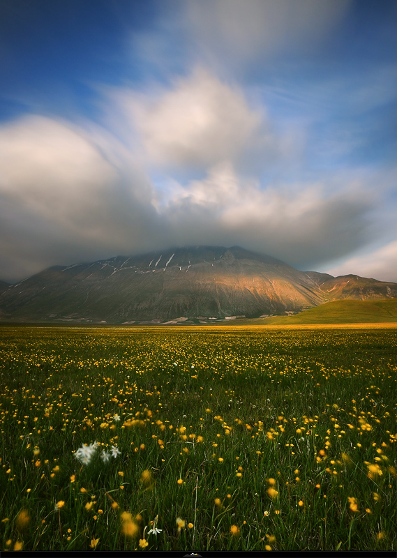 hai scelto bene i tempi lunghi per cogliere il movimento delle nuvole e dei fiori nel vento. la piana di catelluccio si presta a mille soluzioni fotografiche...