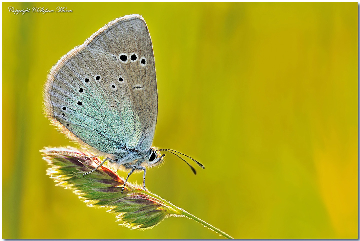 Questa farfalla ad ali aperte è uno spettacolo per via della colorazione azzurro-violetto, ad ali chiuse invece, per via della peluria, non è facile dariprendere, ma mi sembra che hai fatto un buon lavoro. Wink