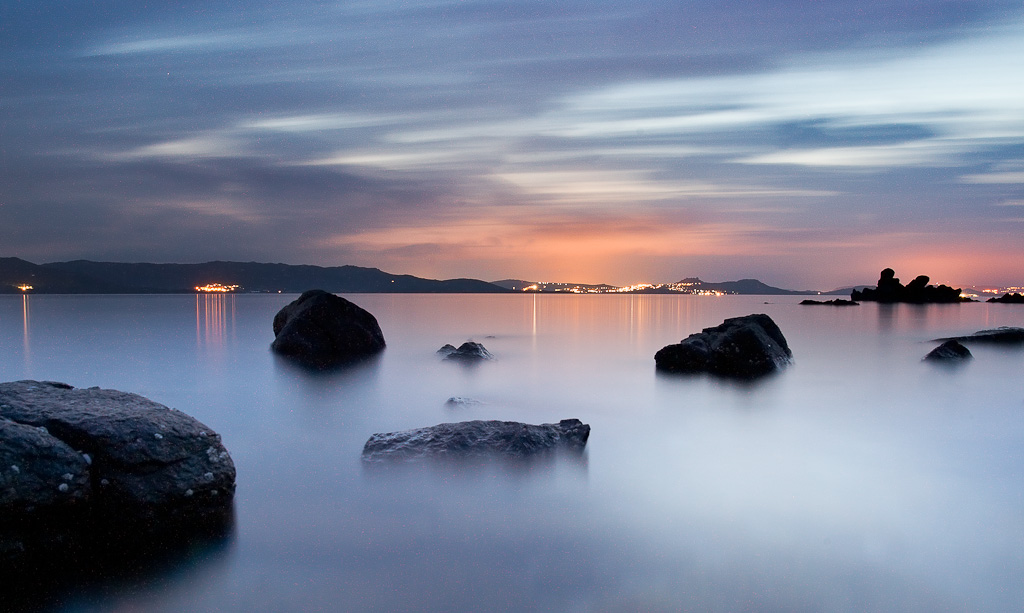 A causa della poca luce (e a causa del mio ritardo nell’arrivare in zona) la foto è stata scattata sfruttando un valore molto alto di ISO (1600) e una lunga esposizione (più di 7 minuti). La scelta di tali parametri di scatto, dettati in parte dalle circostanze (come nel caso del valore così alto degli ISO), hanno permesso di catturare il movimento delle nubi e il chiarore artificiale delle luci della piccola città sarda.