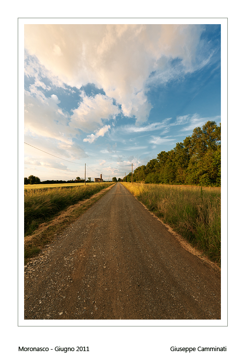 Che bella questa visione speculare dove il cielo col suo movimento di nubi sembra fare il verso alla strada che fra colture,fili e alberi,conduce all'antica Pieve.