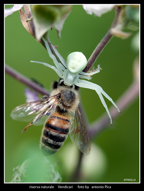 Un buon documento, dove hai saputo giostrarti con una buona composizione. Infatti una diagonale del fotogramma è stata accupata dai due soggetti, mentre l'altra è stata occupata dalle zampe dell'aracnide.